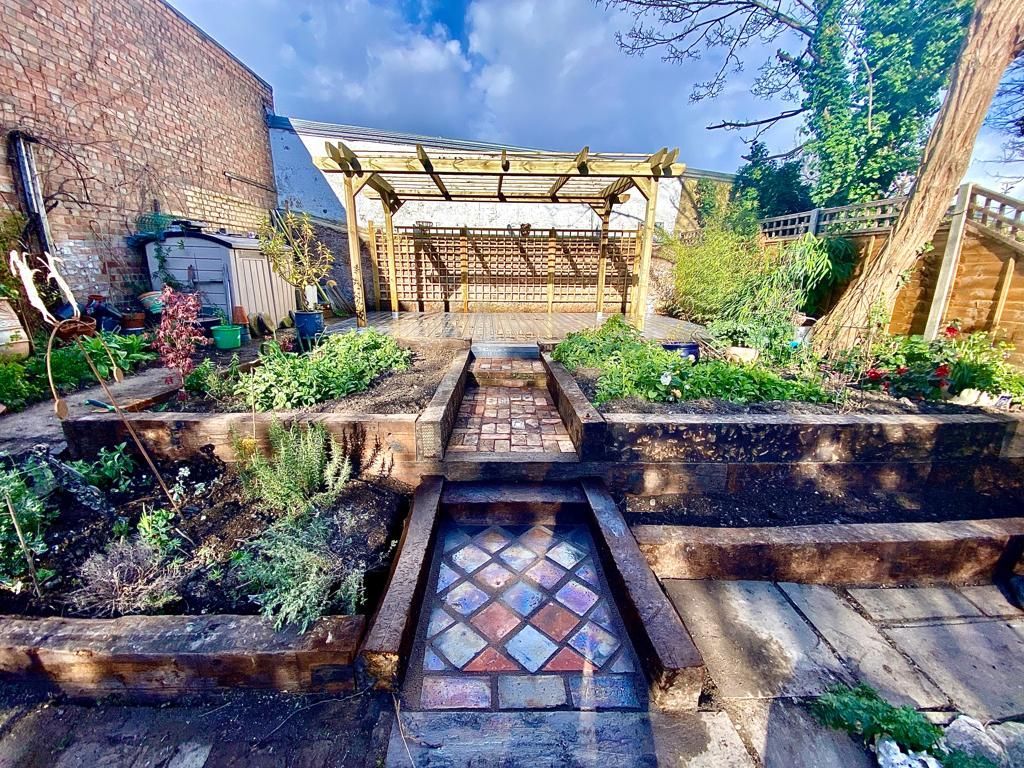 For this project, the client had asked us to transform and tie into the rest of their garden an old concrete base. We erected a timber pergola, put up trellis along the back and planted climbers, then laid a composite decking and used sleepers and the laying of a path to tie everything in